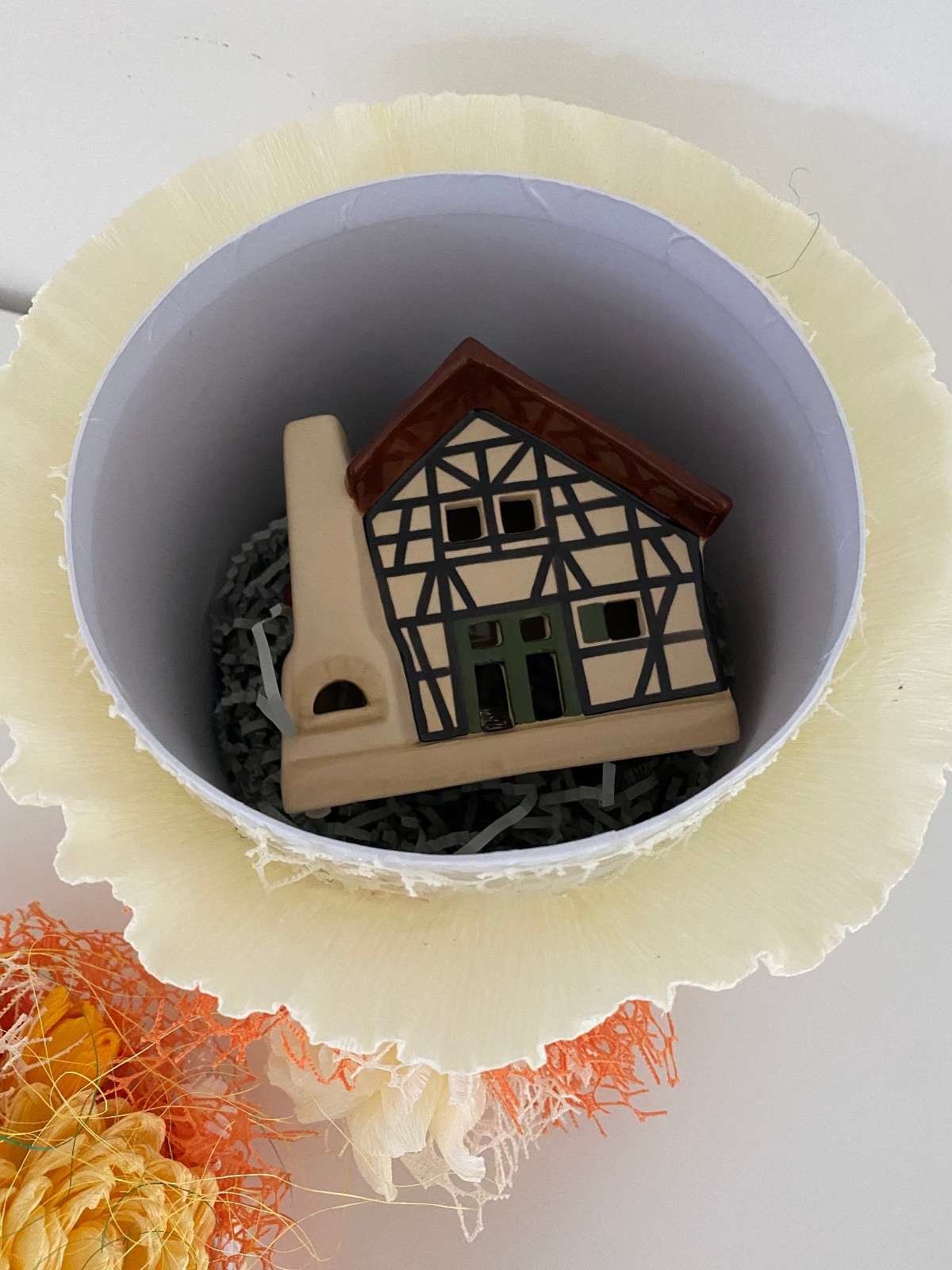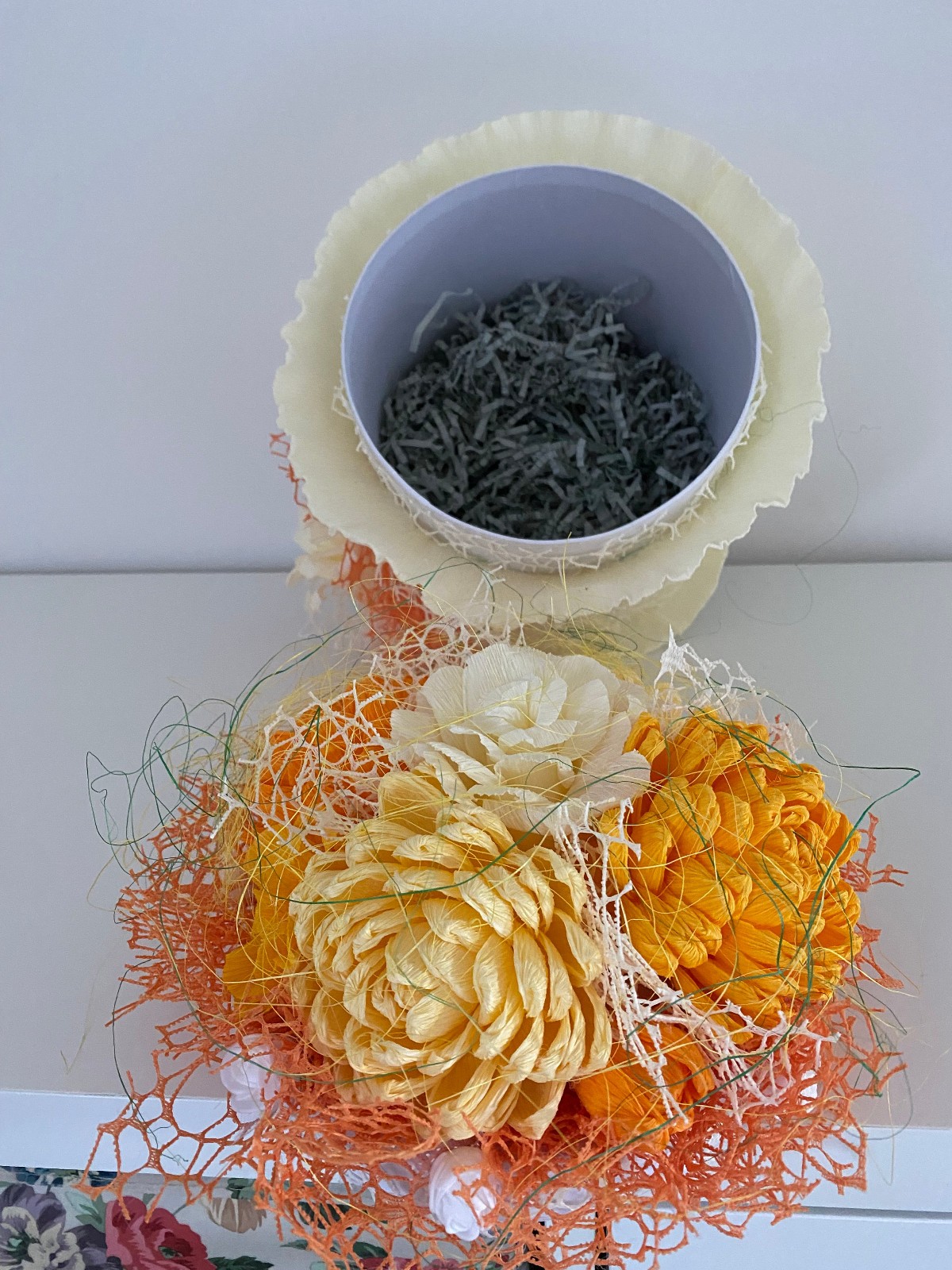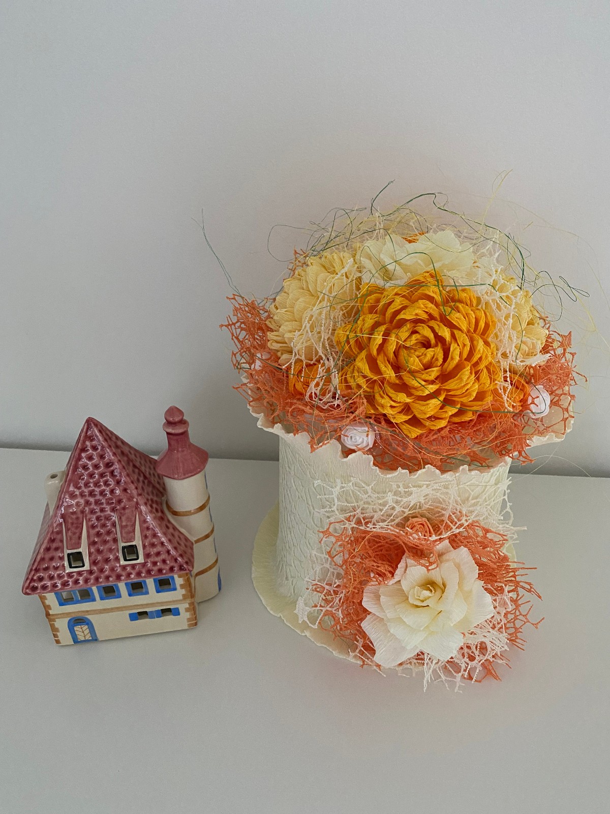Mit viel Liebe zum Detail wurde sie mit handgefertigten Blumen verziert – ein echtes Unikat, das sich perfekt als Geschenkbox oder Dekoration eignet.