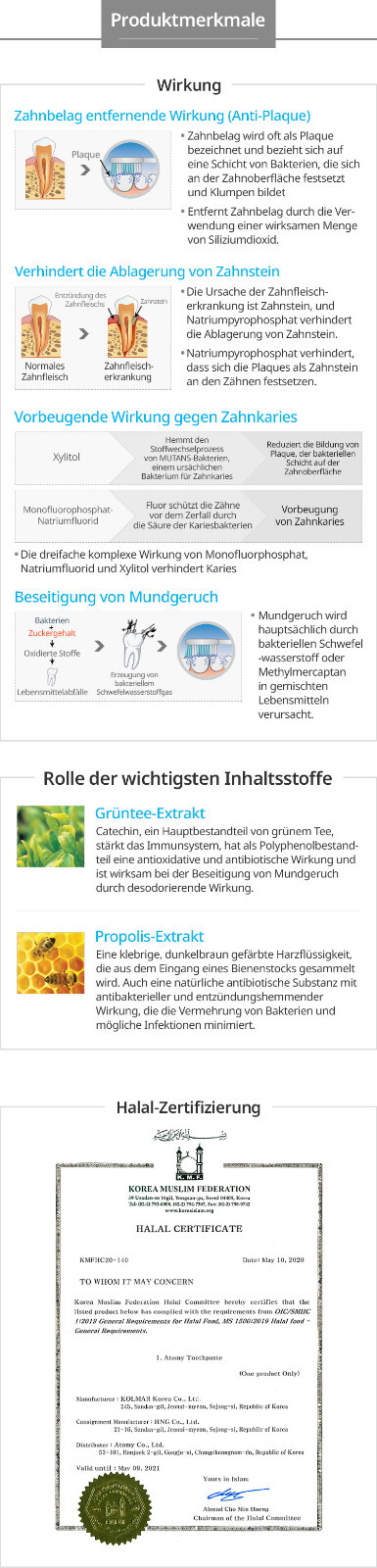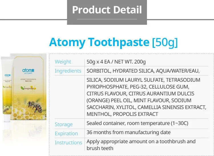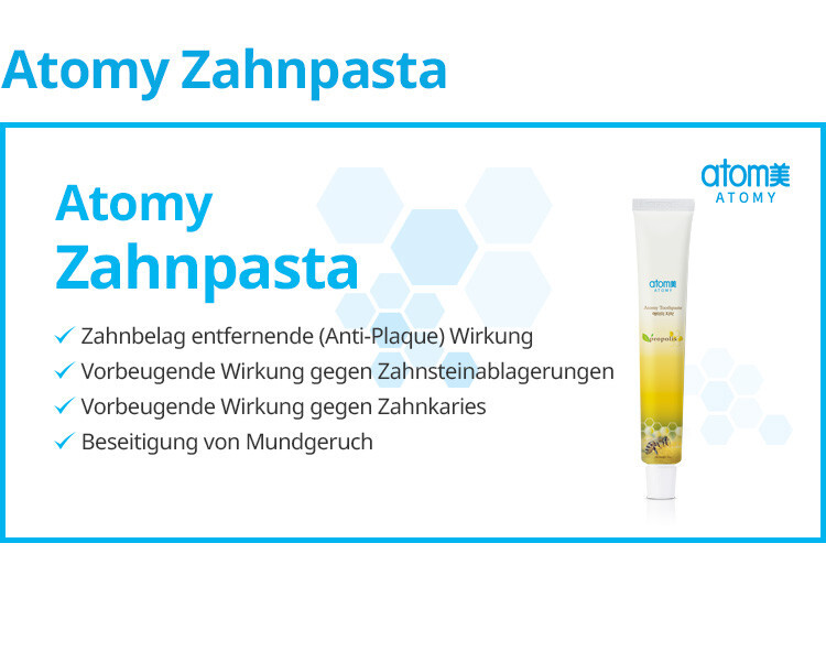 Atomy’s Zahnpasta aus Propolis und Grüntee-Extrakt hinterlässt ein erfrischtes und sauberes Mundgefühl ohne Nachgeschmack. Propolis ist eine harzige Mischung, die Honigbienen aus Baumknospen sammeln und aufgrund ihrer antimikrobiellen Eigenschaften zum Schutz des Bienenstocks verwendet wird – daher das Bild der Honigbiene auf dem Produkt.