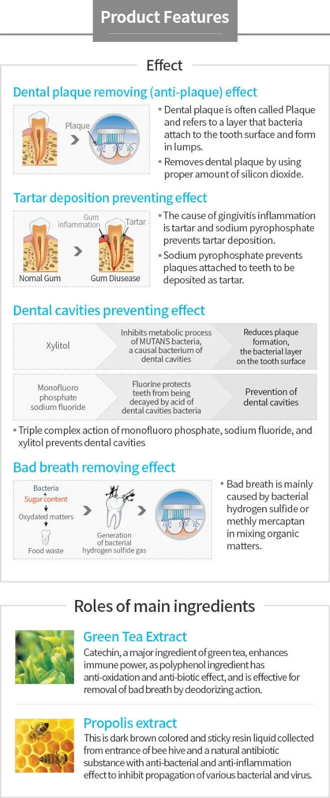 Catechin, ein Hauptbestandteil von grünem Tee, stärkt die Immunkraft, da Polyphenol-Inhaltsstoff antioxidativ und antibiotisch wirkt und durch desodorierende Wirkung wirksam zur Entfernung von Mundgeruch wirkt.