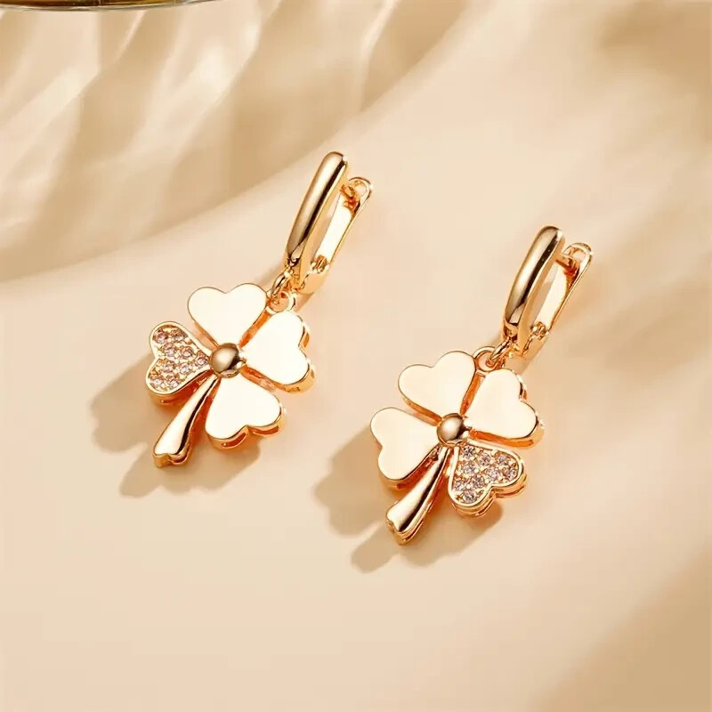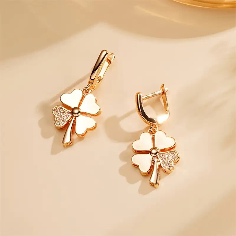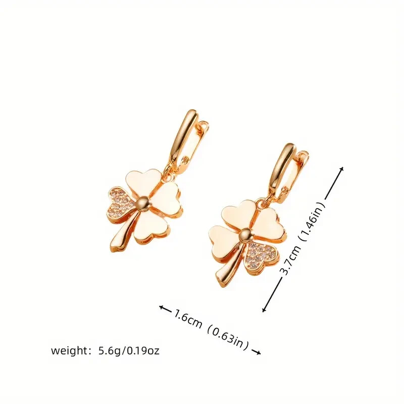 Paar Ohrringe, kluge und niedliche vierblättrige Kleeblatt-Ohrringe, kupfergoldplattiert mit synthetischem Zirkonia, sehr geeignet für den täglichen Gebrauch und Feiertagspartys, ein gutes Geschenk, eleganter Stil, niedlicher Stil, Feiertagsthema