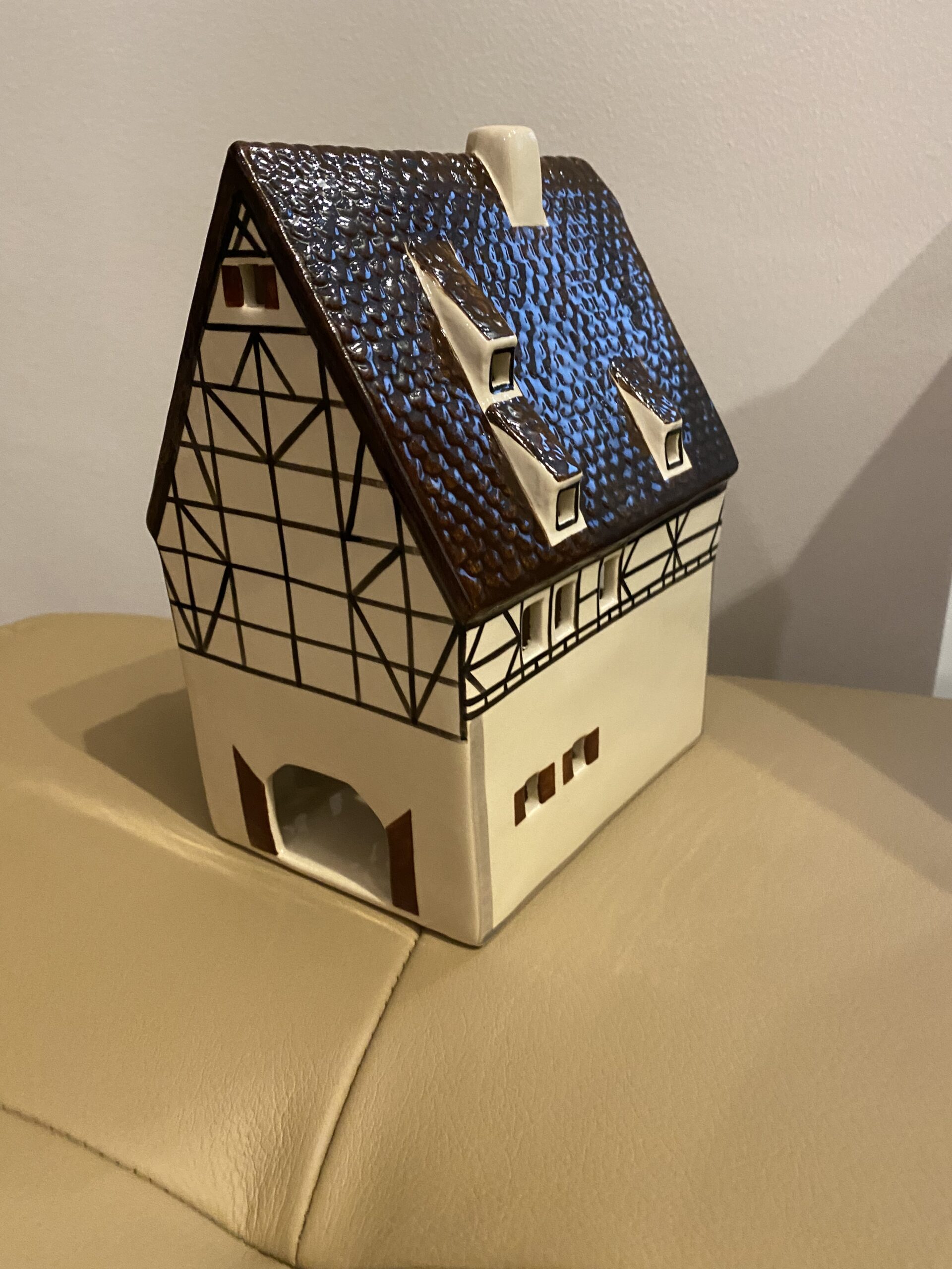 Dieses Sammlerstück, ein echtes Unikat, stammt aus einer Zeit, in der handwerkliches Geschick und Liebe zum Detail bei Weihnachtsdekorationen im Vordergrund standen. Ideal für Liebhaber saisonaler und festlicher Dekorelemente, repräsentiert dieses Haus in Miniaturform die warme, heimische Atmosphäre der Feiertage und ist ein Muss für jede Sammlung aus dem Bereich Dörfer & Häuser.