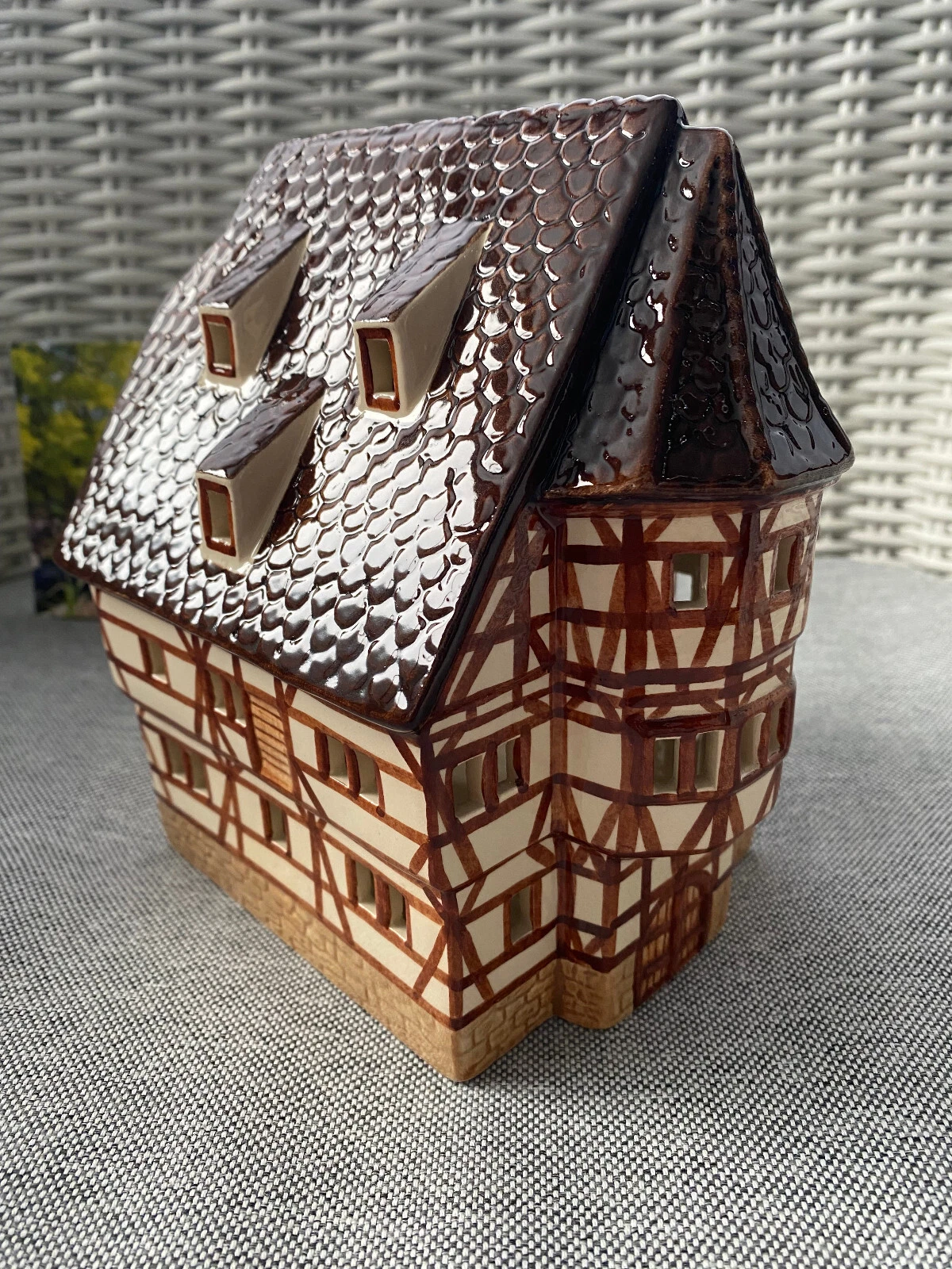 Dieses Sammlerstück, ein echtes Unikat, stammt aus einer Zeit, in der handwerkliches Geschick und Liebe zum Detail bei Weihnachtsdekorationen im Vordergrund standen. Ideal für Liebhaber saisonaler und festlicher Dekorelemente, repräsentiert dieses Haus in Miniaturform die warme, heimische Atmosphäre der Feiertage und ist ein Muss für jede Sammlung aus dem Bereich Dörfer & Häuser.